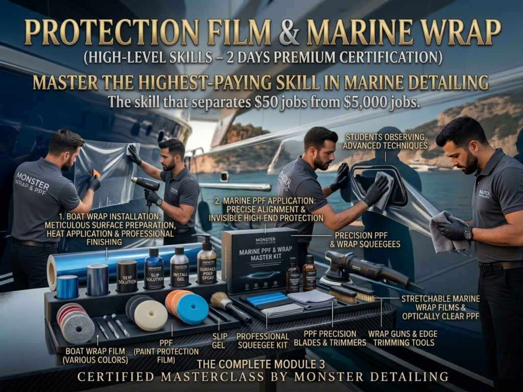 Module 3 is the most advanced level in the Monster Detailing training system, focused on high-ticket, specialized services in the marine industry.
